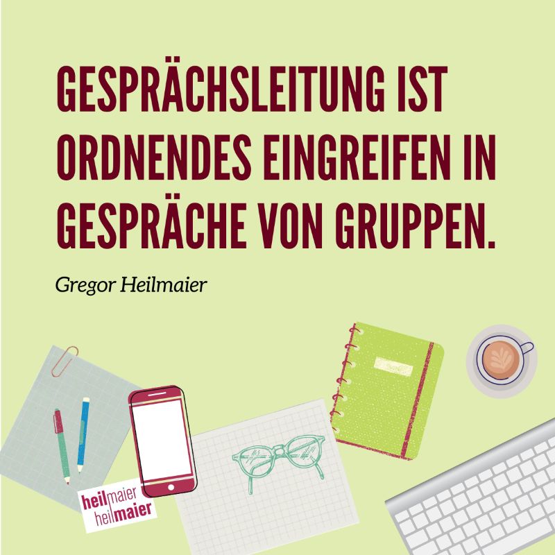Gesprächsleitung oder -führung nennen wir das geordnete Eingreifen in Gruppendiskussionen. Die Reihenfolge der Wortmeldungen wird von einer Person berücksichtigt, auf Einhaltung des Gesprächsprotokolls und der Zeit wird geachtet.